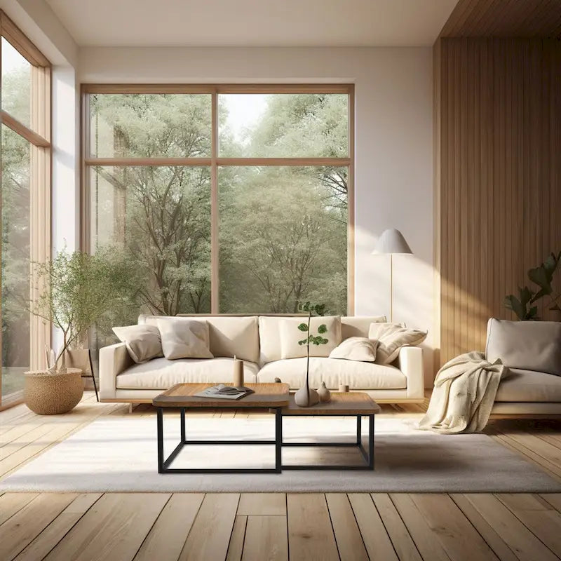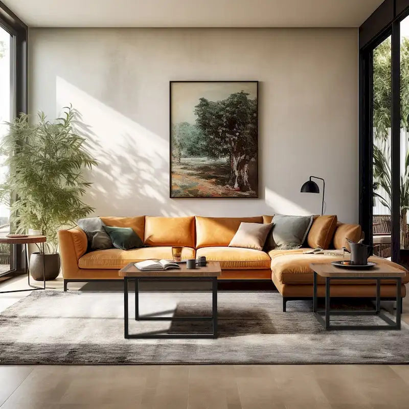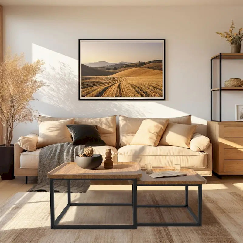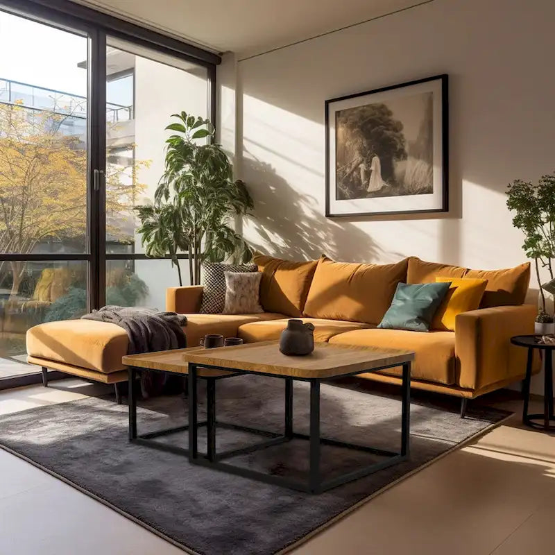 Two-piece nesting coffee table set with walnut wood finish and black metal frame. Tables can be used together or separately in different rooms.